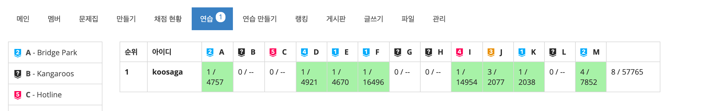 - K. Failure function을 링크 컷으로 관리하면 된다. 초반부터 많이 풀려서 링크 컷을 안 쓰고 쉽게 할 수 있는 방법을 오랫동안 고민했는데 찾지 못했다. 그리고 포기한 후 링크 컷을 짰는데 정작 10분 정도밖에 안 걸렸다. 처음부터 뇌절했으면 차라리 나았을 듯... 정해는 해싱으로 $N^{1.5}$ 정도에 하는 거고, 잘 이해는 안 가지만 상수가 적으면 $O(N^{1.5}\log N)$ 도 통과하나 보다.