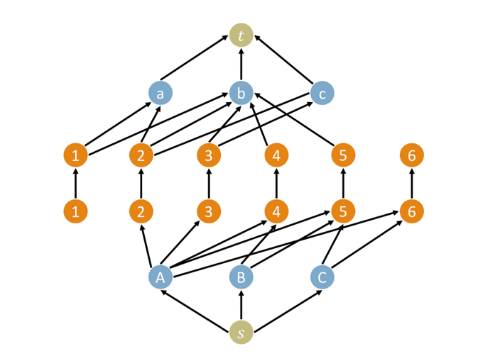 이분 매칭은 특정 그래프의 최대 유량이고, 최대 유량은 최소 컷 (Min-cut max-flow theorem) 입니다. 고로 우리는 각 날짜에 풀게 될 과목을 적절히 배치해서 최소 컷의 합을 최소화하는 문제를 해결한다고 볼 수 있습니다.