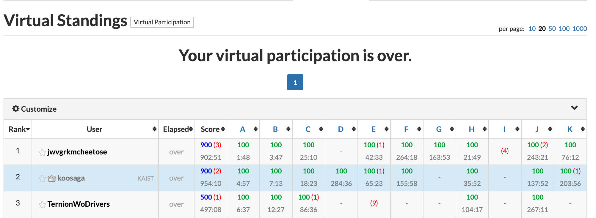 - D는 몇가지 가정을 넣으면 대충 Max 3-SAT으로 환원이 된다. 이 가정하에는 결국 만족한 clause 비례 점수가 추가되는 시스템이다. 열심히 했지만 특정 시점에서 진전이 없어서 그냥 최적해에 매우 근접한 걸 찾은 게 아닐까 싶었는데 까 보니 타 진출팀 비해서 점수가 상당히 낮았다. 그런데 여기서 고득점 받았다는 팀들이 한 건 다 해봤는데 뭐가 문제인지 모르겠다. D는 5028790이 계속 찍히기에, 그리고 그게 98% 이상 배정을 했다기에, 이 정도면 optimal이 아닐까 하고 기피한 점도 있다.