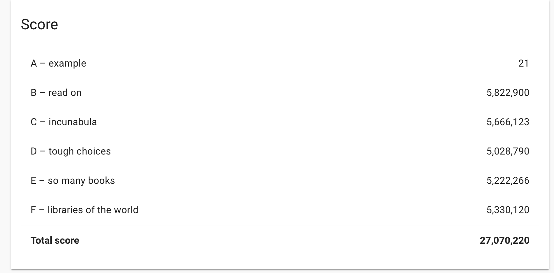 - E/F가 어려운 입력이고 그냥 대충 어렵게 생겼다. 둘 다 비슷비슷하지만 E는 signup time이 작고, F는 signup time이 크다는 차이가 있다. 둘 다 simple greedy에서 시작하고, 상수 파라미터를 조금씩 튜닝해 보다가, kdh한테서 flow 이야기가 나오기에 min-cost flow를 구현해봤다. 그리디로 무슨 library를 선택할 지, 그리고 선택할 순서를 고정시킨 후 교집합을 전송하는 과정에서 낭비가 생기기 때문에 max cost matching을 사용해서 교집합을 제거해 주고, 선택된 library 집합 내에서 optimal하게 보내는 것이다. 이걸 구현한 후 점수가 15만점 올라갔다. 15만점! 사실상 여기서 승부를 봤다. 이후에 hill climbing으로 데이터를 계속 깎아서 자잘한 점수를 꽤 올렸다.