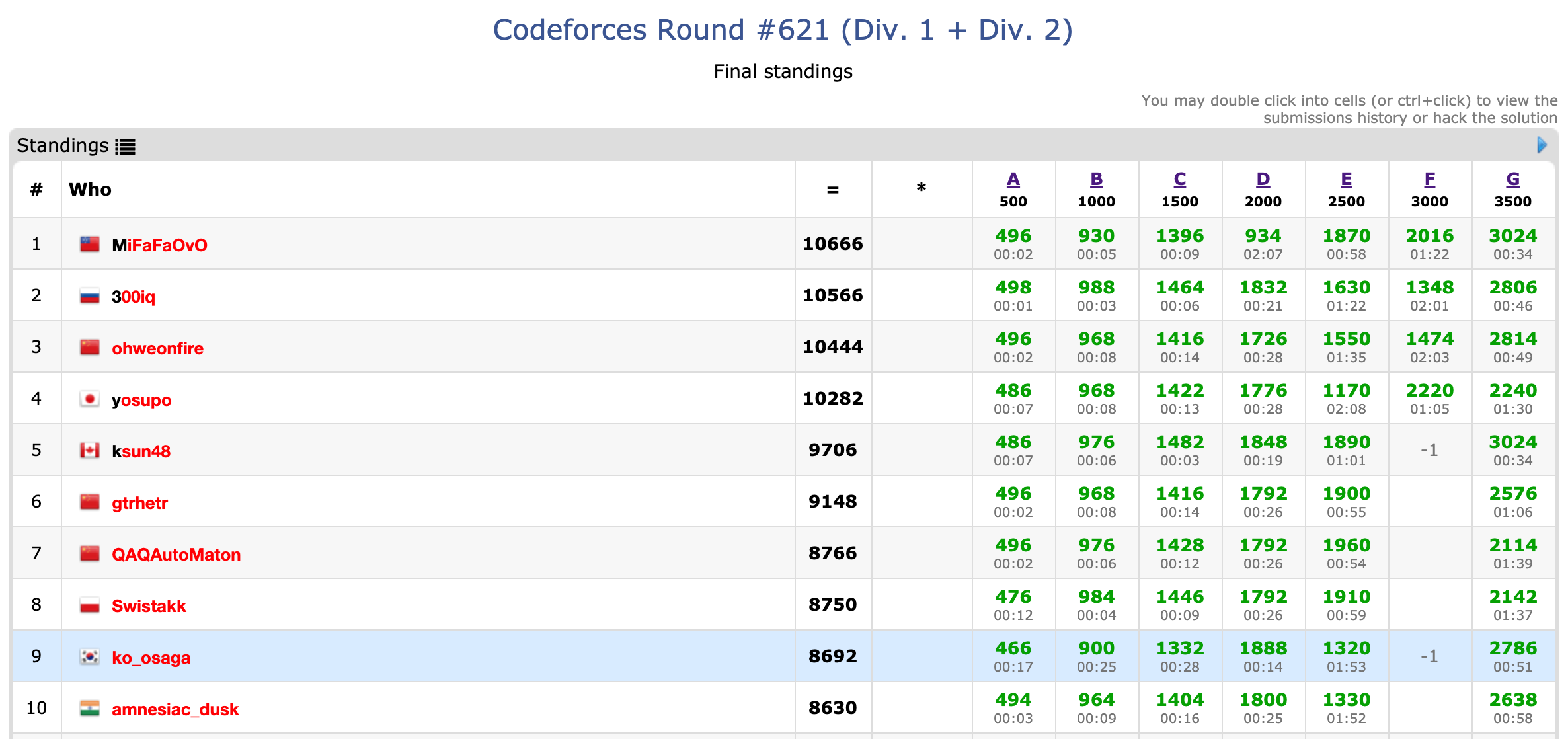 - G: F 풀고 1시간 남았을 때 kdh가 매칭 문제라고 알려줬다. 이분 매칭도 아니고 일반 매칭이라서 이걸 직접 구할 시도는 전혀 안하고, 구성적인 풀이를 계속 고민했지만 실패했다. 시간 제한이 5초고 입력으로 가능한 경우의 수가 작았는데 눈치를 못 챘다.. 아무튼 의도한 풀이는 blossom을 돌리면 그냥 잘 나온다였다.