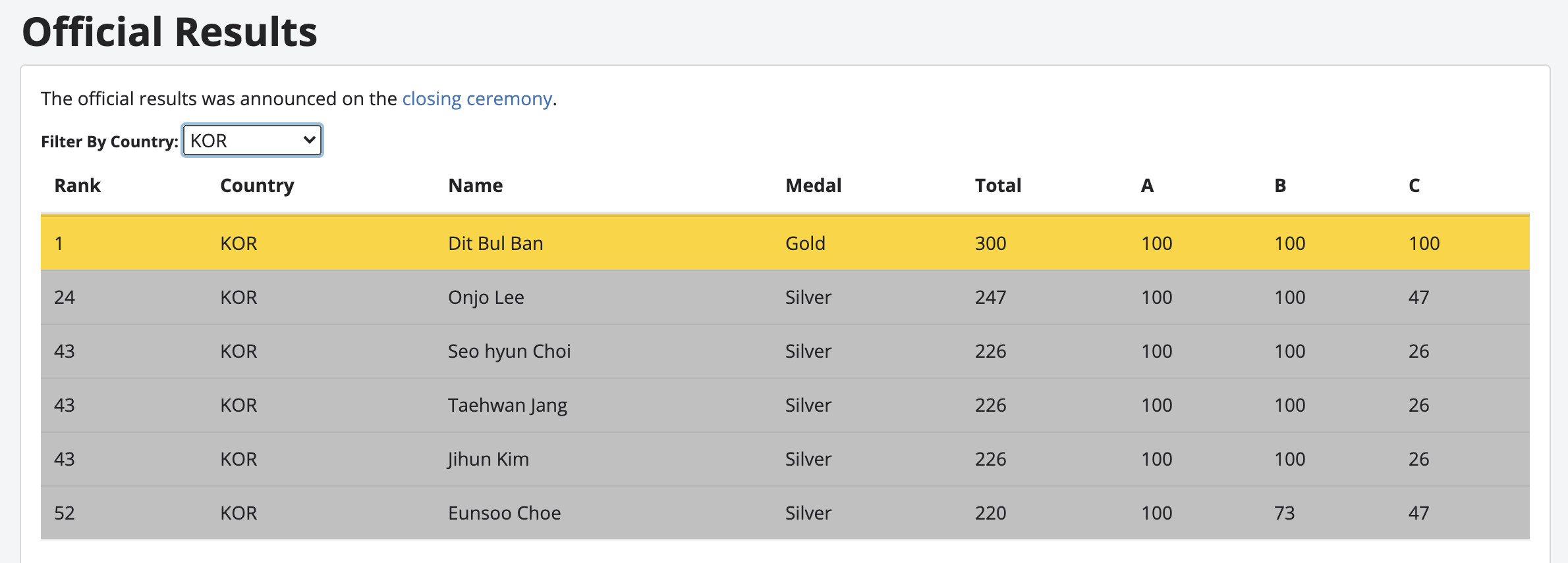 올해 학생들 성적은 1금5은으로 예년과 비슷한 편으로 보인다. 반딧불이 300점 만점에 300점을 받아서, 2015년 이후 첫 APIO 만점과 함께 금메달을 얻었다. 반딧불 학생은 올해 IOI 국가대표이기도 한데, 아직 고등학교 1학년이니 앞으로도 좋은 결과가 기대된다. 그 뒤를 이어 이온조, 최서현, 장태환, 김지훈, 최은수 학생이 은메달을 얻었다. 모두 축하합니다!