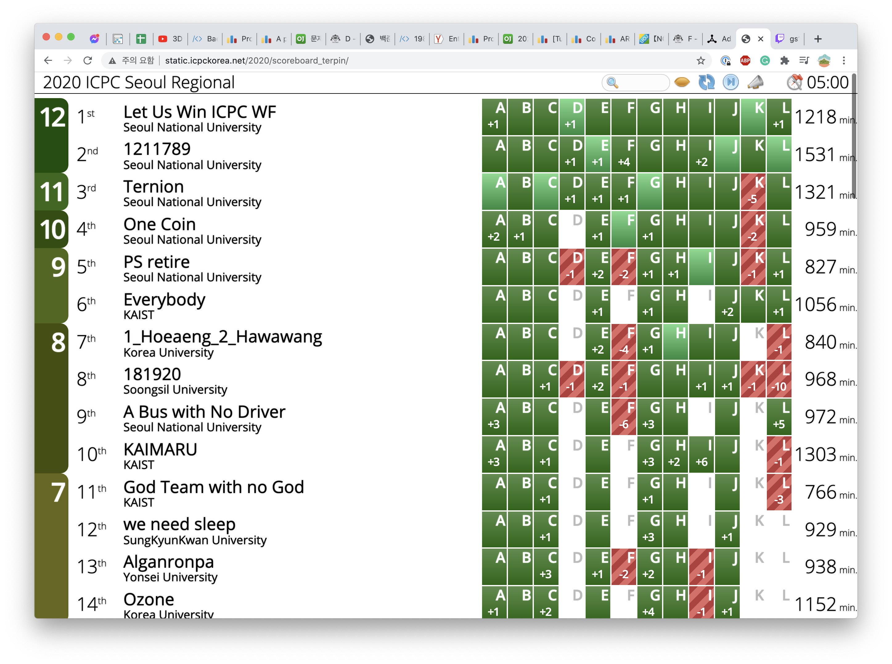 - 서울대학교 내전. 올해 서울대학교는 예년처럼 절대적인 최강팀들이 있어서 그 팀이 나가는 게 확실시되는 (혹은 모두의 예상을 깨고 그 예상이 깨지는) 구도가 아니라, 월드 파이널을 누가 나가더라도 이상하지 않은 강팀 여럿이 싸우는 구도로 대회가 진행되었다. 최상위권 참가자들이 한 팀에 뭉치기 보다는 다양한 팀으로 나뉘었기 때문이다. 이런 점 때문에 스코어보드 상에서 (서울대 꼴지 팀) >> (그 외 대학 1등 팀) 과 같은 모습이 심심치 않게 보이는, 대규모 스케일의 살벌한 경쟁을 볼 수 있었다.