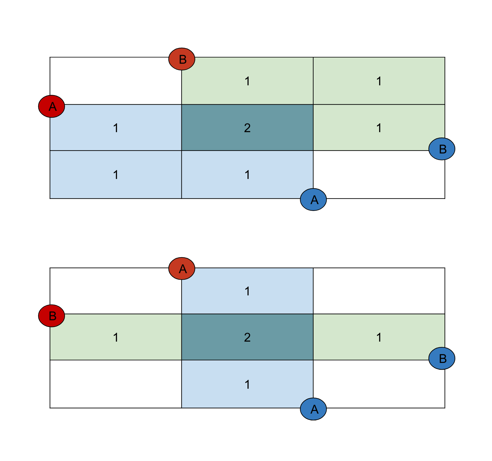 이는 간단한 DP로 해결할 수 있다. $DP[i][j][k]$ 를, $1 - 2 - \ldots - i$ 번까지 direct를 모두 완료했으며, 첫 번째 그래프에서 $(i-1) - i$ 번 간선의 방향이 $j$이고, 두 번째 그래프에서 $(i - 1) - i$ 번 간선의 방향이 $k$ 일 때, 답이 존재하면 true, 아니면 false라고 하자. $DP[2][][]$ 는 직접 채운 후, $DP[i][][]$ 를 통해서 $DP[i+1][][]$ 를 채워줄 수 있다. 다음에 오는 간선의 방향을 전부 시도해 보고 입력 수열과 맞을 때 dp 값을 전파시켜주면 되기 때문이다. 이러한 방식으로 $O(N)$ 에 문제가 해결된다.