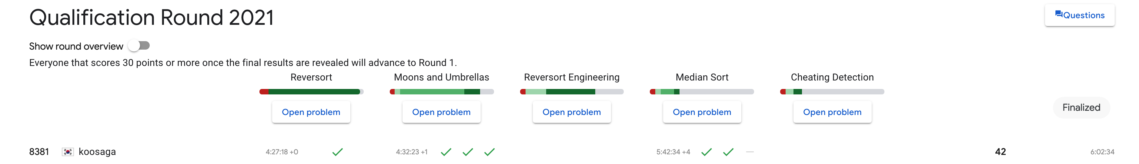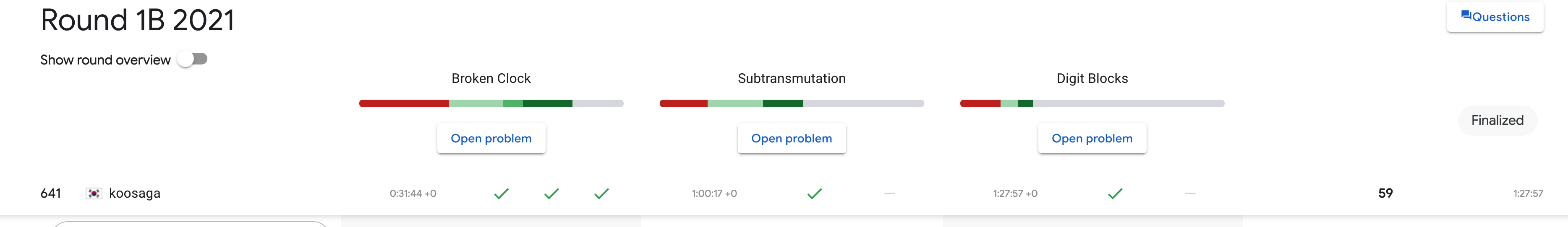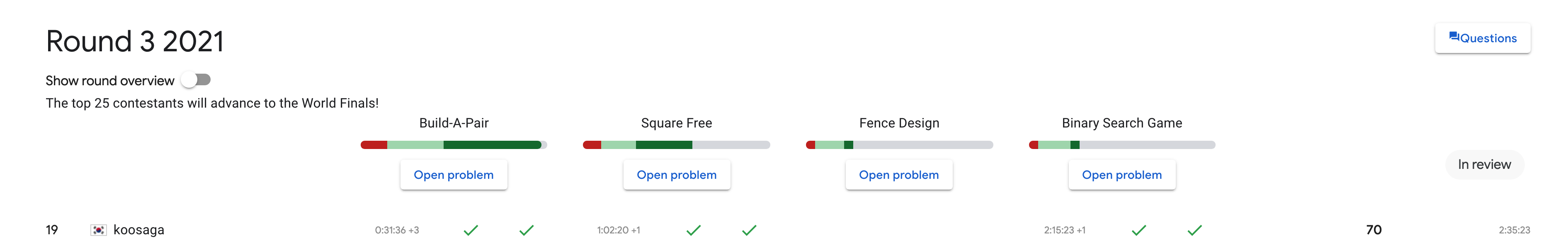 ABD를 푼 이후에는 15분이 남았고 C는 0점이었다. C를 Small만 풀어도 통과할 거라는 확신이 있었지만, 그러기에도 시간이 너무 없는 상황이었다. 그 사이에 딴짓도 하고 여러 방황을 했지만, 멘탈 잡고 차근차근, 정말 Small만 풀 수 있는 아주 간단한 풀이를 생각해보기로 했다. 그리고 위에서 했던 온갖 관찰과 구질구질한 케이스가 필요 없는 아주 나이브한 $O(N^3)$ 풀이를 생각했다, 그냥 지금 교차하는 현이 없으면 추가하는 걸 반복하는 풀이 -_- 그런데 이 때 5분 남아서 이걸 짜기도 너무 늦었었다. C 풀때 진작 생각했으면 안정적으로 진출했을 것 같지만... 하여튼 그 이후 조마조마하게 스코어보드를 기다렸다. 반쯤 체념하고 기다렸는데 의외로 D번을 푼 사람이 적고 C는 3명밖에 없어서 파이널 진출.