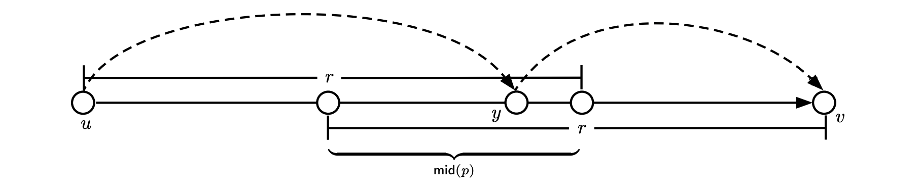 $P$ 의 원소 $p = apath(u, v, x) \in P$ 에 대해, $mid(p)$를 $|p[u, y]| < r, |p[y, v]| < r$ 을 만족하는 정점 $y \in p$ 의 집합이라고 하자. 여기서, $p[a, b]$ 는 경로 $p$ 에서 정점 $a \rightarrow b$ 로 가는 부분경로 (subpath) 이다. 자세한 것은 아래 사진을 참조하라.