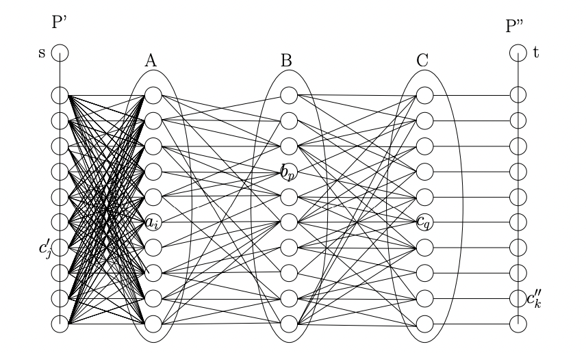 - 모든 $i, j \in [n]$ 에 대해 가중치가 $w(i, j)$ 인 간선 $(a_i \rightarrow b_j), (b_i \rightarrow c_j)$ 를 추가한다.