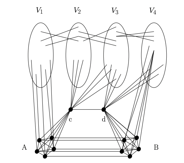 - $A$ 의 서로 다른 두 정점 사이를 무향 간선으로 이어 클리크를 만든다. $B$ 에 대해서도 동일하게 한다.
